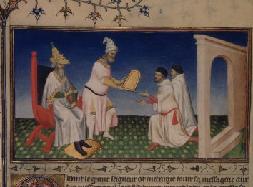 Here Marco and his uncles are giving the Khan the oil from Jerusalem
